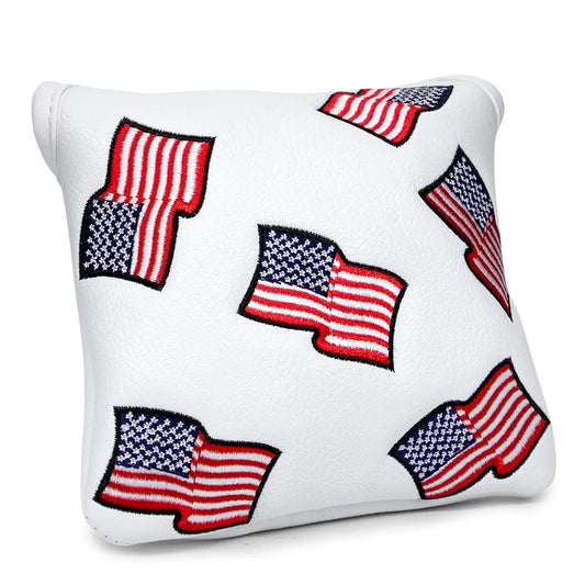 USA Flag Embriodered Square White Leather Golf Mallet Putter Head Cover with Magnetic Closure