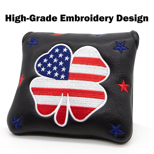 USA Flag & Stars Lucky Square Black Leather Golf Mallet Putter Head Cover with Magnetic Closure
